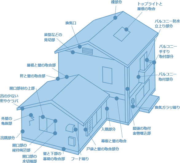 住宅は様々な雨漏り対策をしております。だからこそある部位が劣化してくるとそこから雨漏りをしてきます!右の図が主な雨漏り箇所です。全部を調べていたら時間が足りない…。
