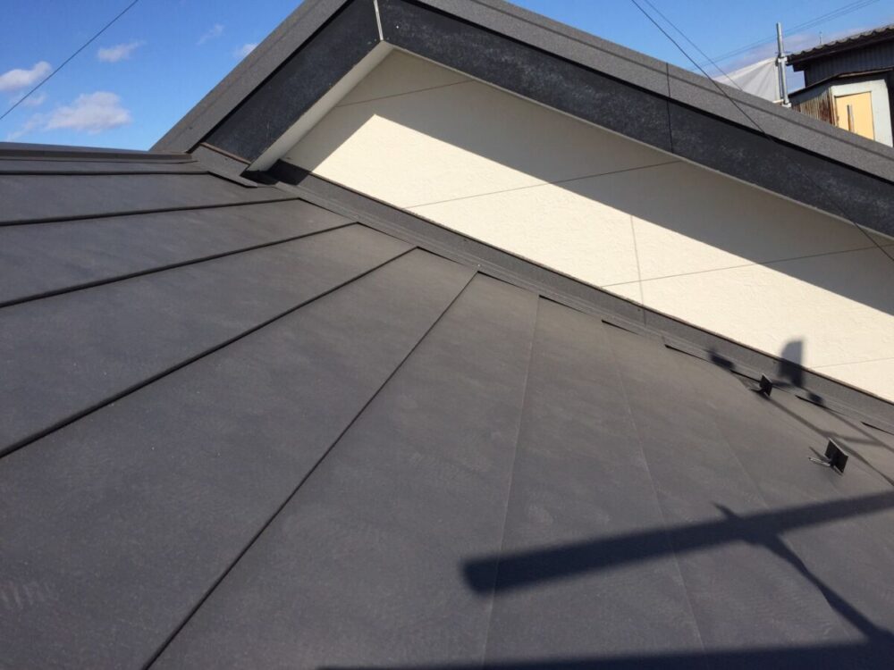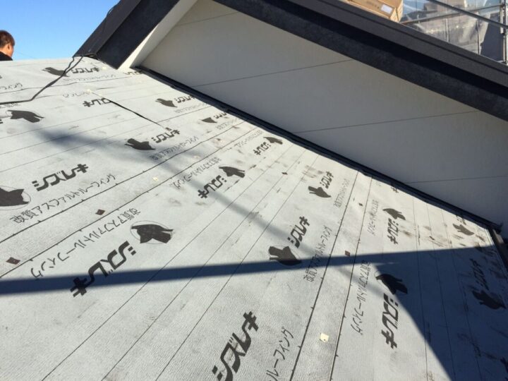 【粘着ルーフィング貼り】防水シートを貼ったのちに、金属屋根を張ります。防水シートと屋根材の2つが新しくなることで屋根本来の機能を取り戻すことができます。
