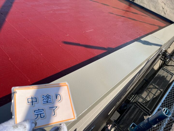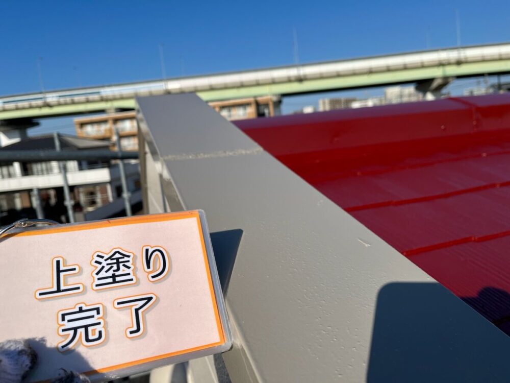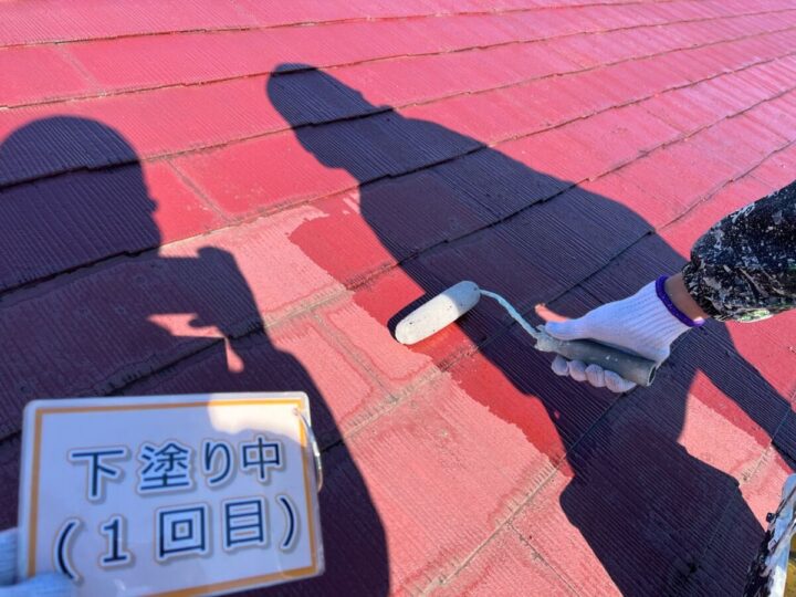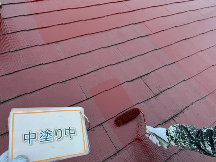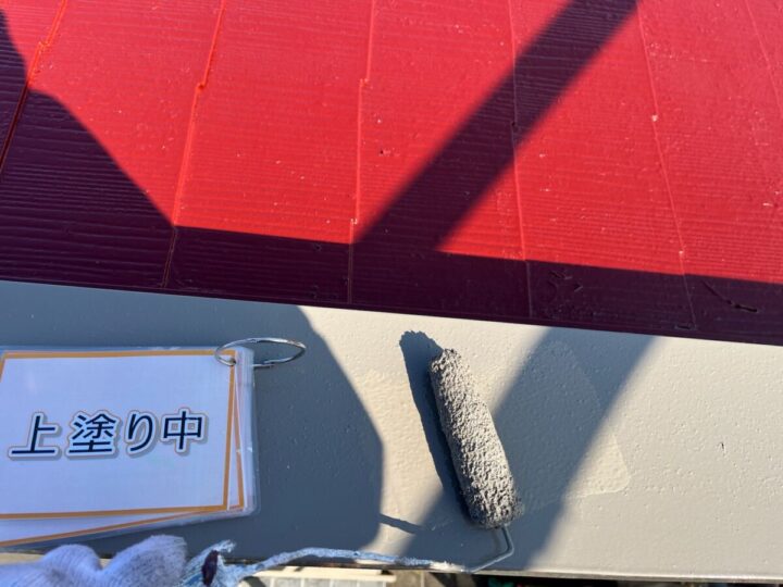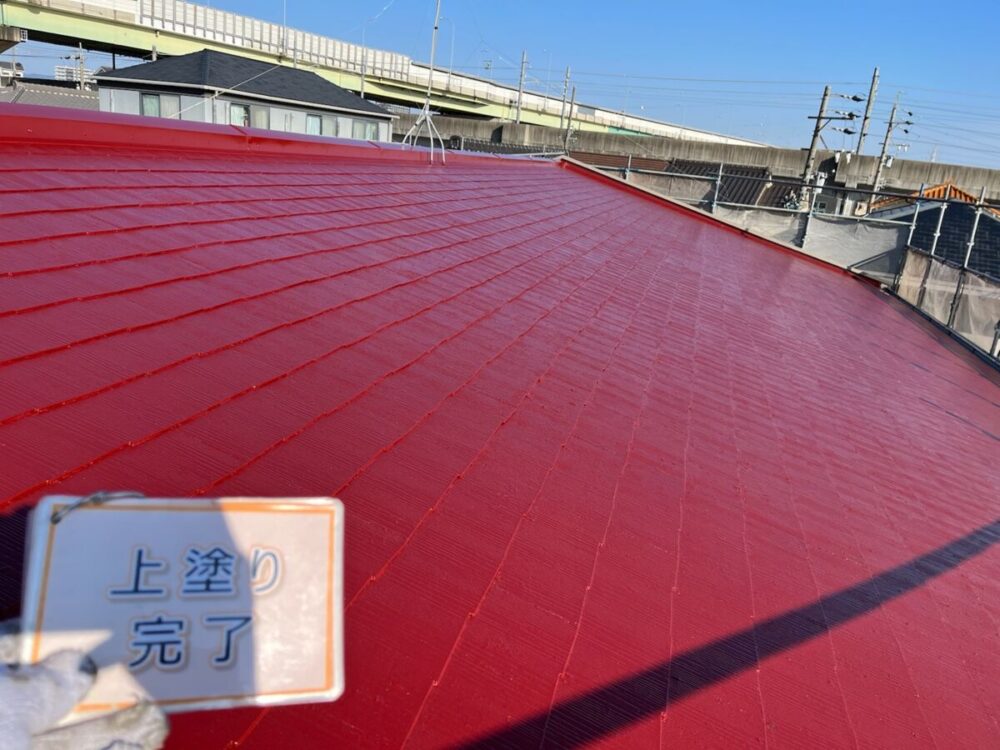 【上塗り】塗料を3回塗り重ねることで艶が増し、紫外線や雨水に強い耐久性のある屋根に仕上がります。