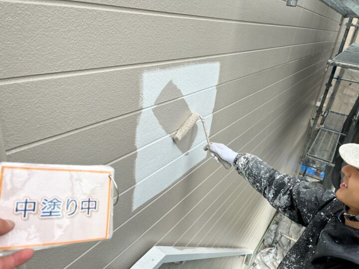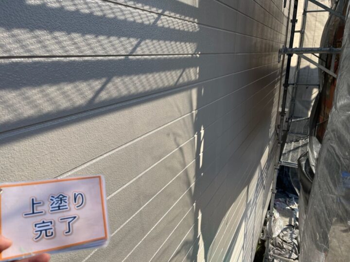 【上塗り】塗料を3回塗り重ねることで外壁の艶が増し、紫外線や雨水に強い耐久性のある外壁に仕上がります。