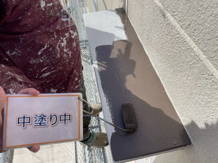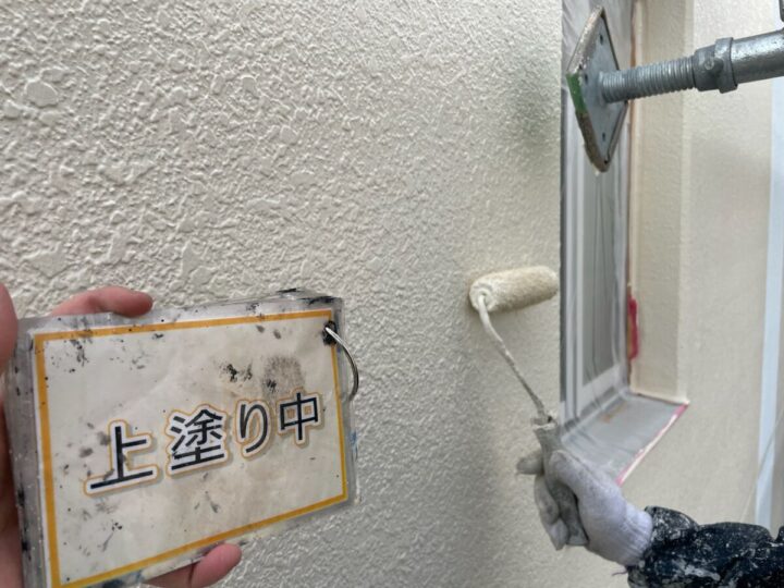 【上塗り】塗料を3回塗り重ねることで外壁の艶が増し、紫外線や雨水に強い耐久性のある外壁に仕上がります。