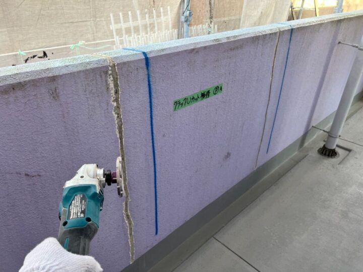 【カット】ひび割れに沿って電動カッター等を用いてU字型の溝をつくります。