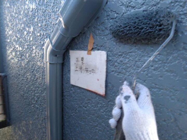 【上塗り】塗料を3回塗り重ねることで外壁の艶が増し、紫外線や雨水に強い耐久性のある外壁に仕上がります。