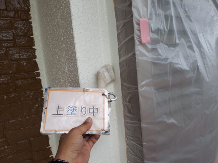 【上塗り】塗料を3回塗り重ねることで外壁の艶が増し、紫外線や雨水に強い耐久性のある外壁に仕上がります。