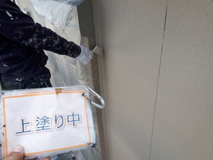 【上塗り】塗料を3回塗り重ねることで外壁の艶が増し、紫外線や雨水に強い耐久性のある外壁に仕上がります。