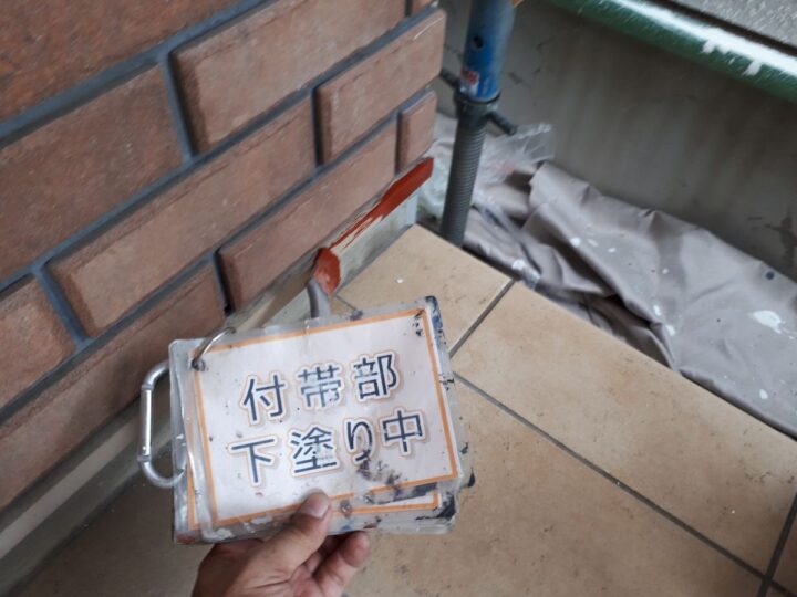 【プライマー塗布】隅の部分から雨漏りしやすいため、隅々まで丁寧に塗布していきます。