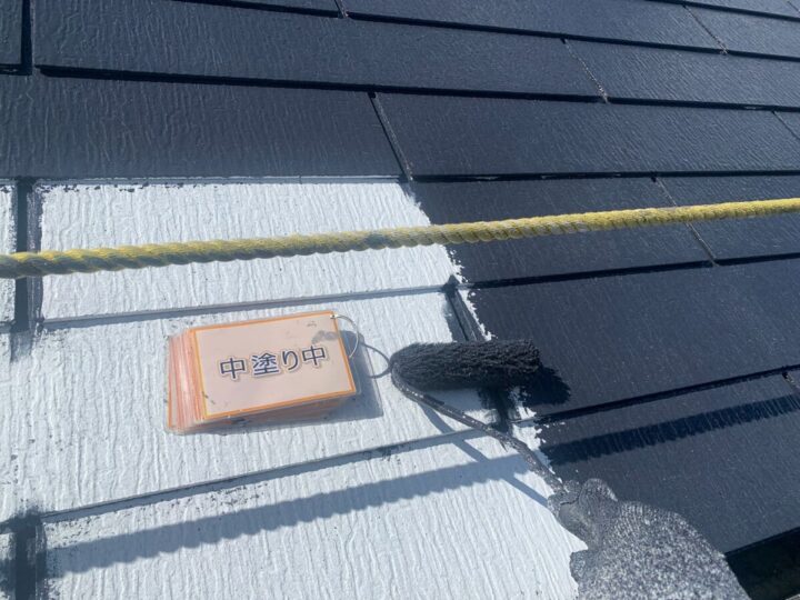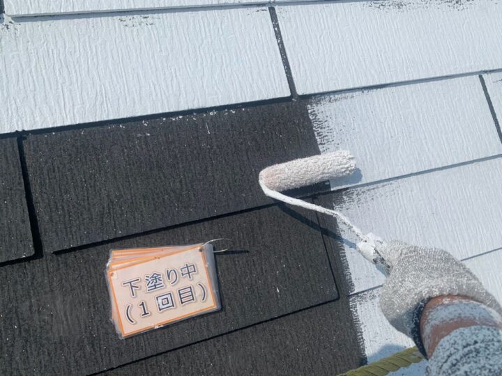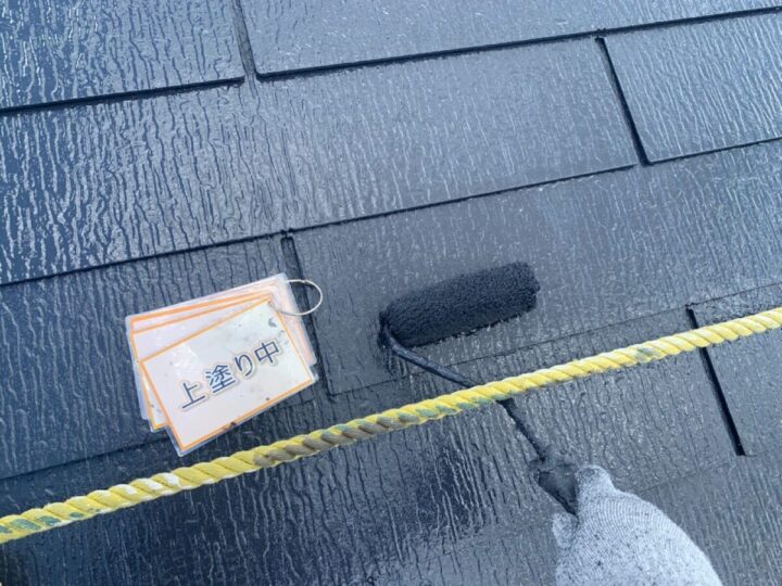 【上塗り】塗料を3回塗り重ねることで艶が増し、紫外線や雨水に強い耐久性のある屋根に仕上がります。
