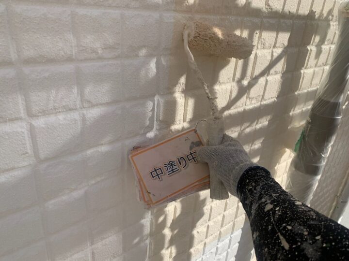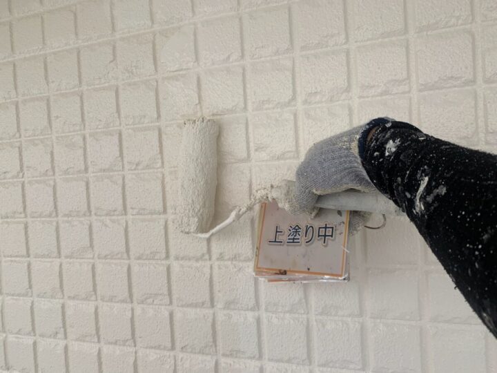 【上塗り】塗料を3回塗り重ねることで外壁の艶が増し、紫外線や雨水に強い耐久性のある外壁に仕上がります。