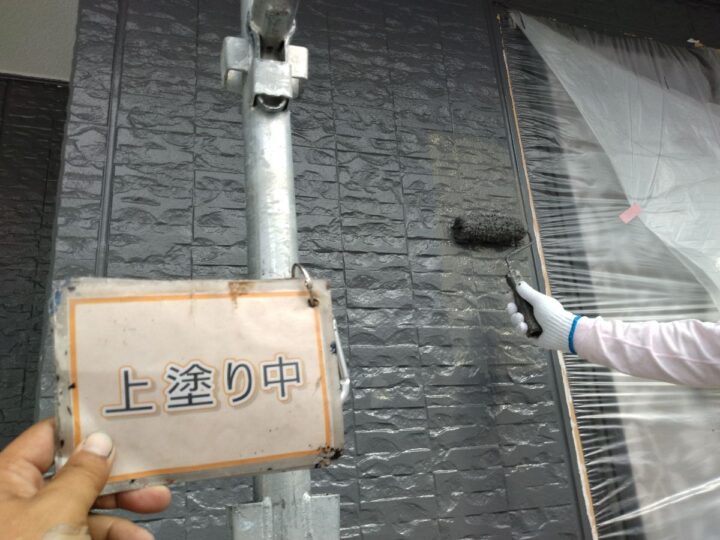 【上塗り】塗料を3回塗り重ねることで外壁の艶が増し、紫外線や雨水に強い耐久性のある外壁に仕上がります。