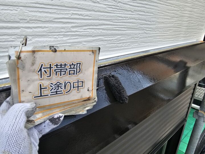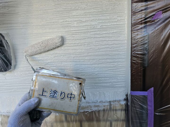 【上塗り】塗料を3回塗り重ねることで外壁の艶が増し、紫外線や雨水に強い耐久性のある外壁に仕上がります。