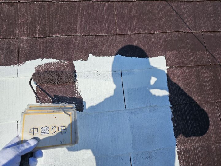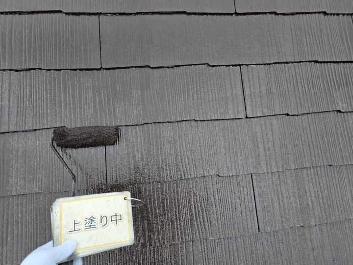 【上塗り】塗料を3回塗り重ねることで艶が増し、紫外線や雨水に強い耐久性のある屋根に仕上がります。