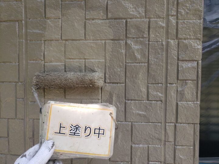 【上塗り】塗料を3回塗り重ねることで外壁の艶が増し、紫外線や雨水に強い耐久性のある外壁に仕上がります。