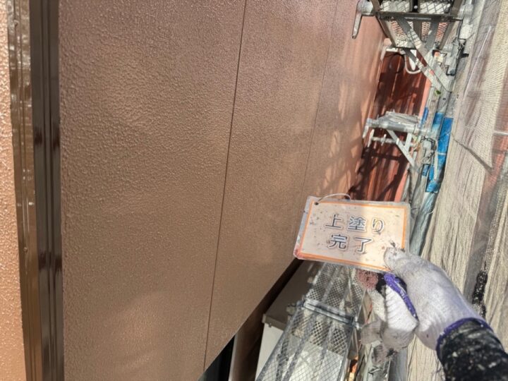 【上塗り】塗料を3回塗り重ねることで外壁の艶が増し、紫外線や雨水に強い耐久性のある外壁に仕上がります。