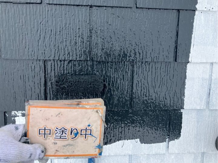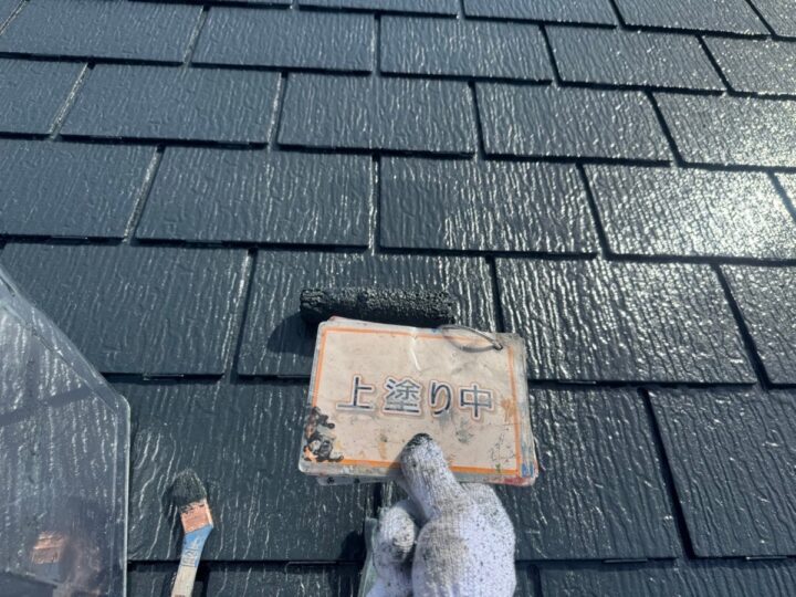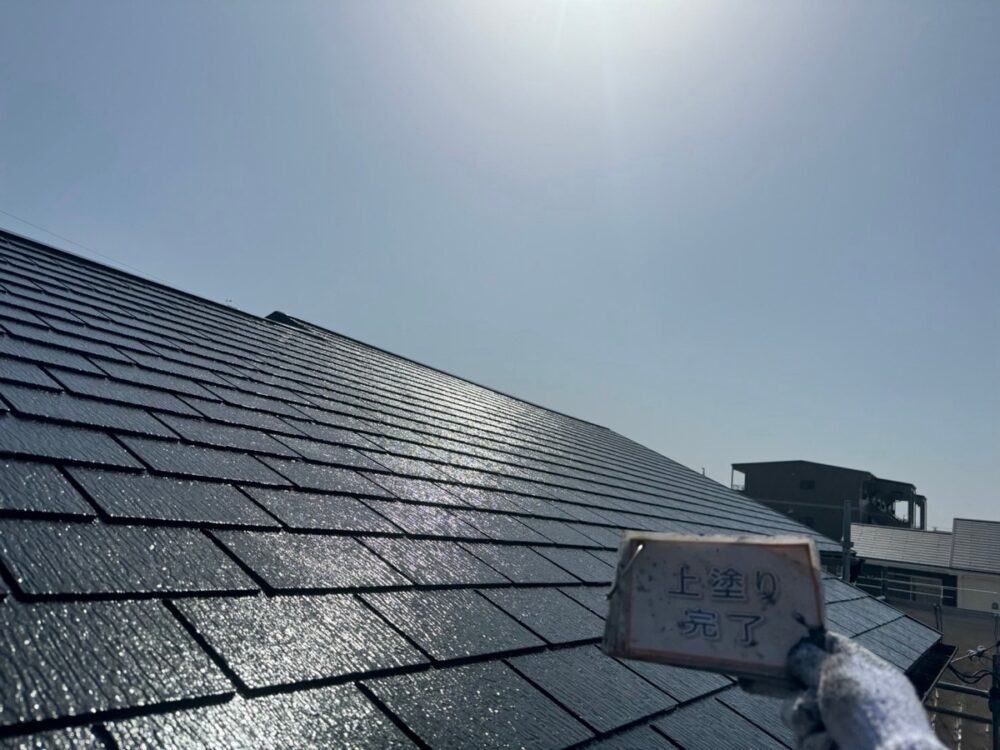 【上塗り】塗料を3回塗り重ねることで艶が増し、紫外線や雨水に強い耐久性のある屋根に仕上がります。