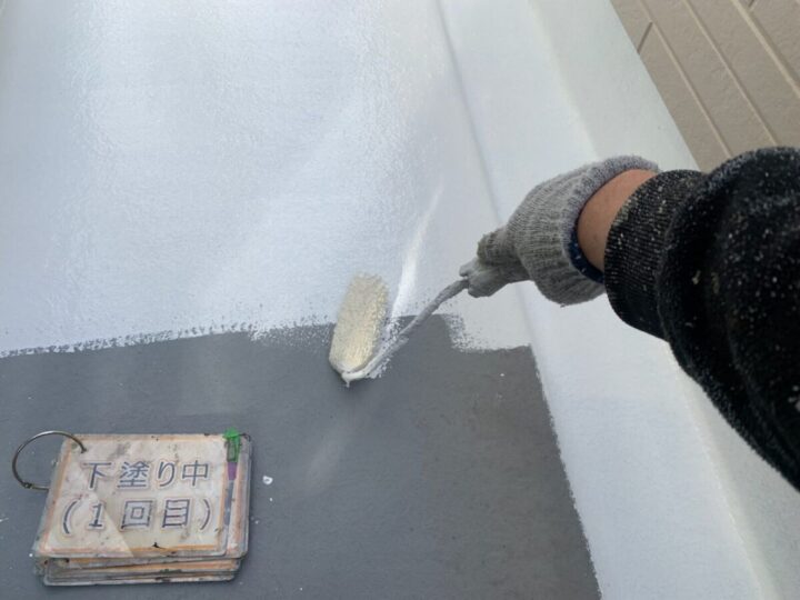 【プライマー塗布】隅の部分から雨漏りしやすいため、隅々まで丁寧に塗布していきます。