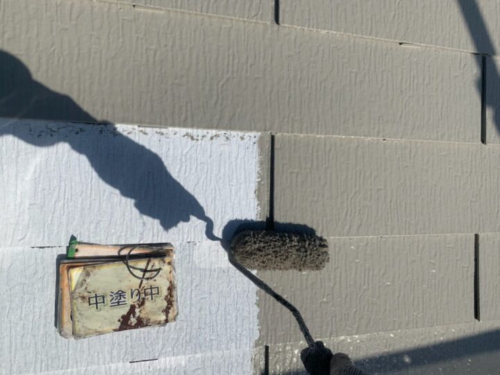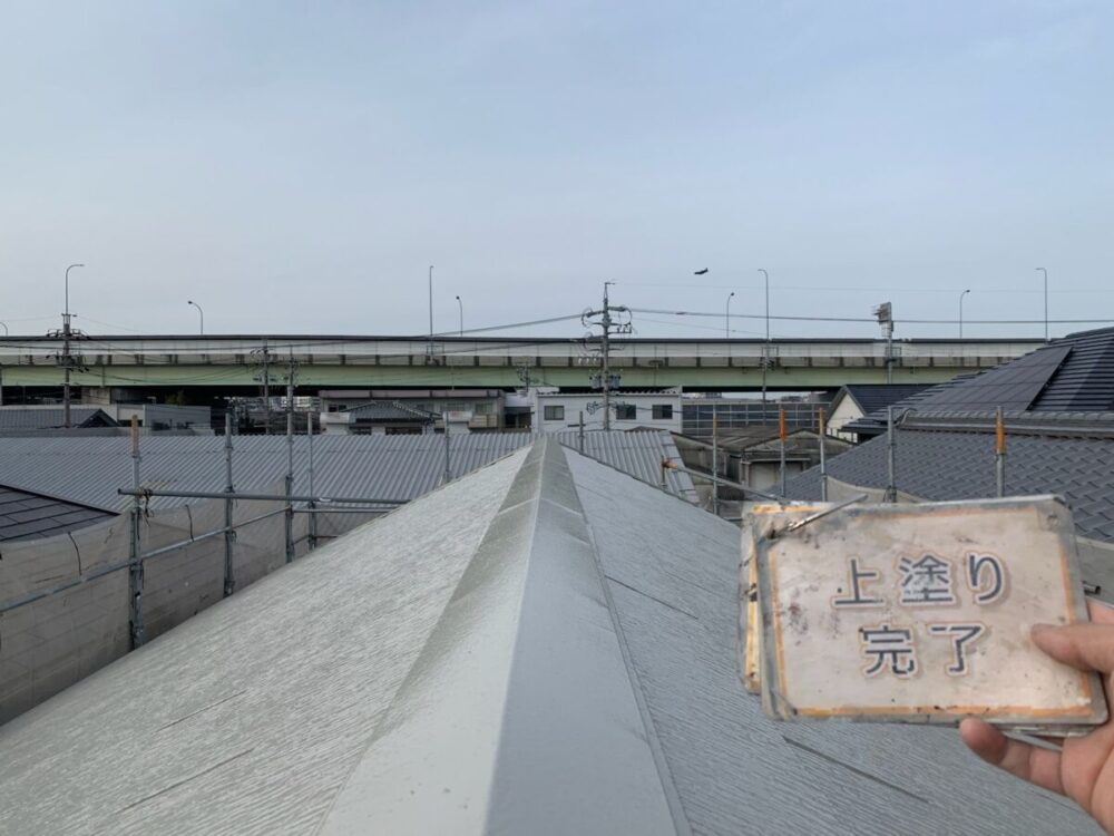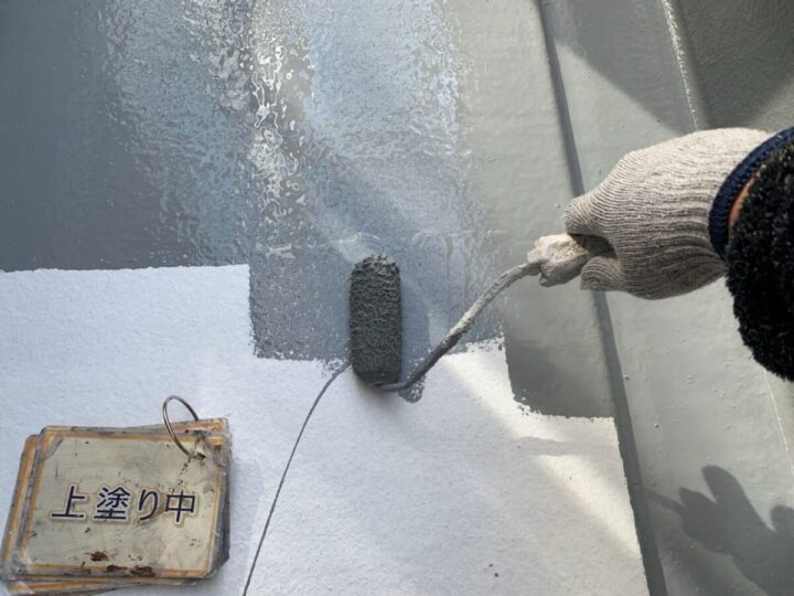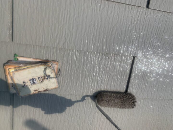 【上塗り】塗料を3回塗り重ねることで艶が増し、紫外線や雨水に強い耐久性のある屋根に仕上がります。