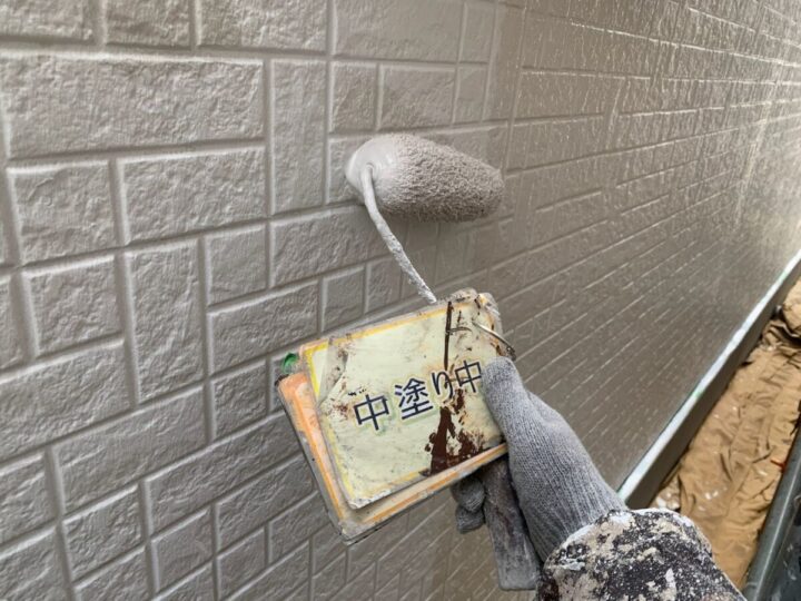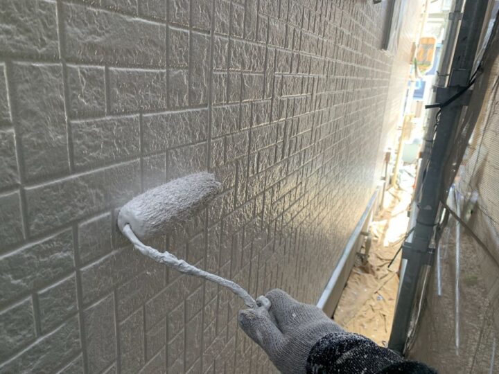 【上塗り】塗料を3回塗り重ねることで外壁の艶が増し、紫外線や雨水に強い耐久性のある外壁に仕上がります。