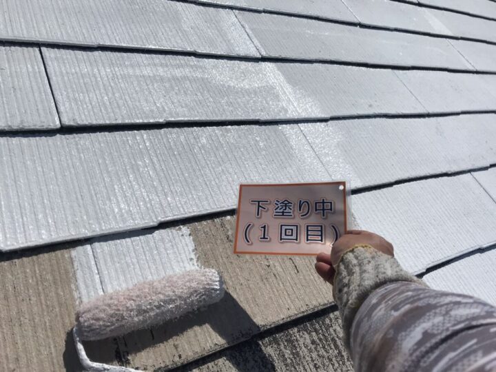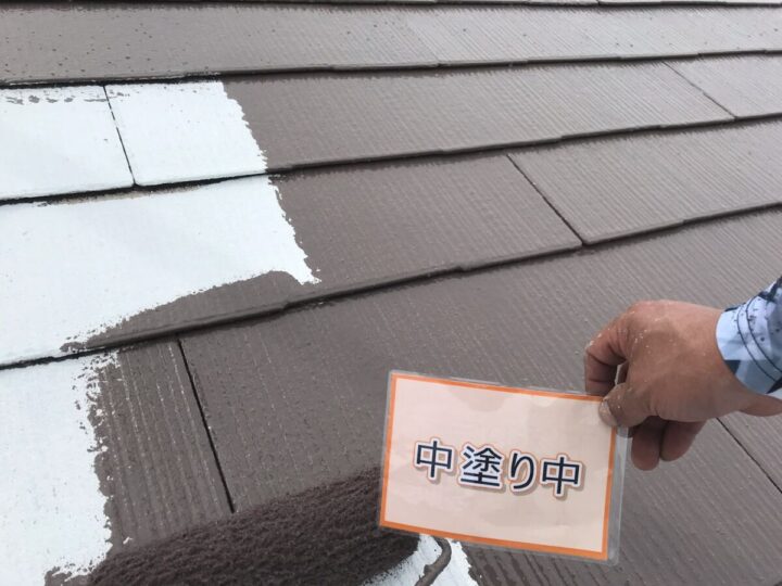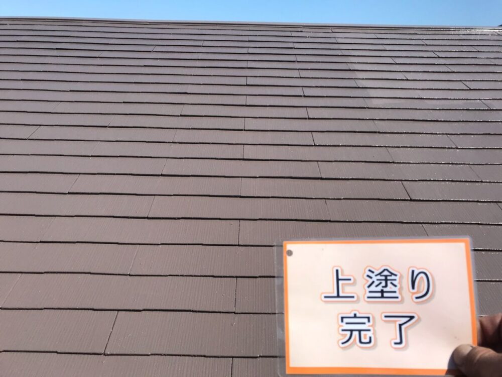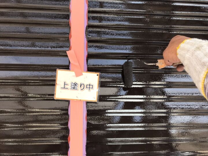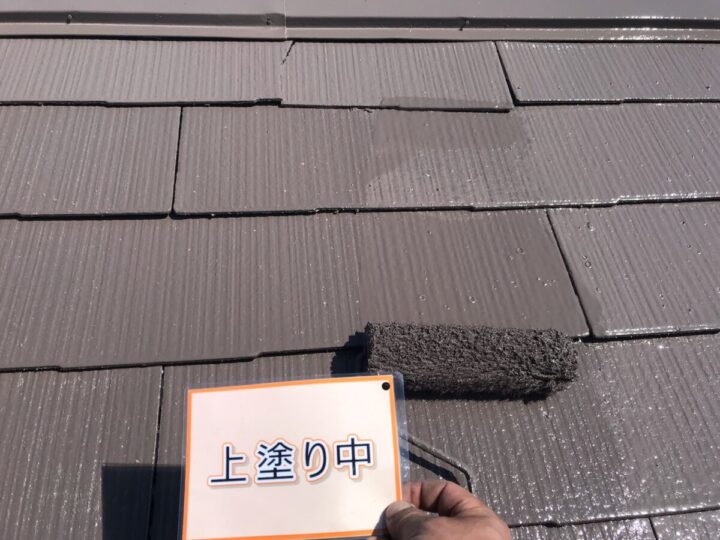 【上塗り】塗料を3回塗り重ねることで艶が増し、紫外線や雨水に強い耐久性のある屋根に仕上がります。