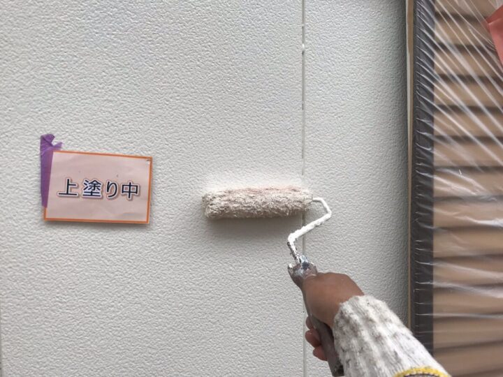 【上塗り】塗料を3回塗り重ねることで外壁の艶が増し、紫外線や雨水に強い耐久性のある外壁に仕上がります。