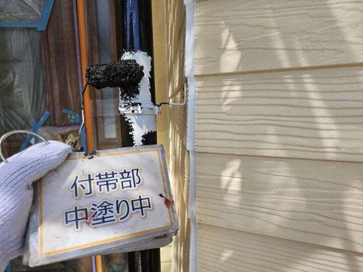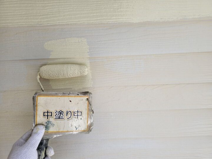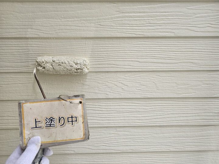 【上塗り】塗料を3回塗り重ねることで外壁の艶が増し、紫外線や雨水に強い耐久性のある外壁に仕上がります。