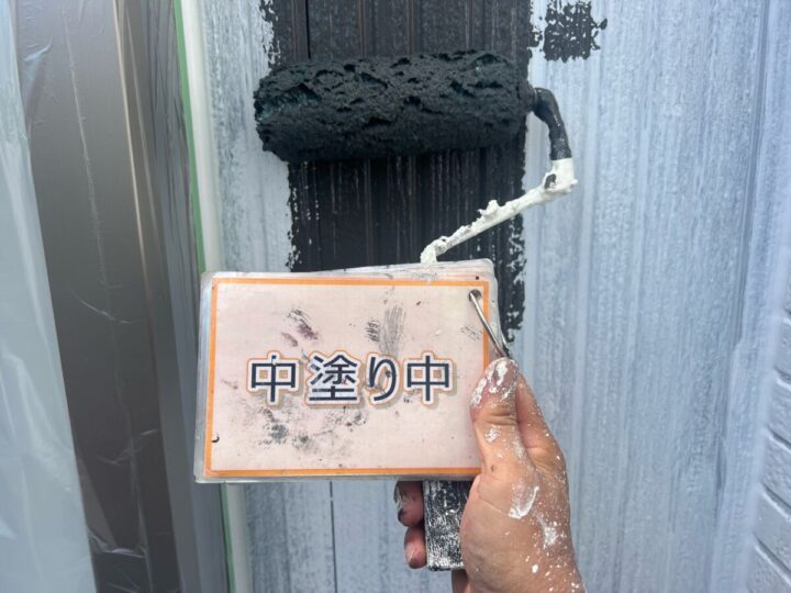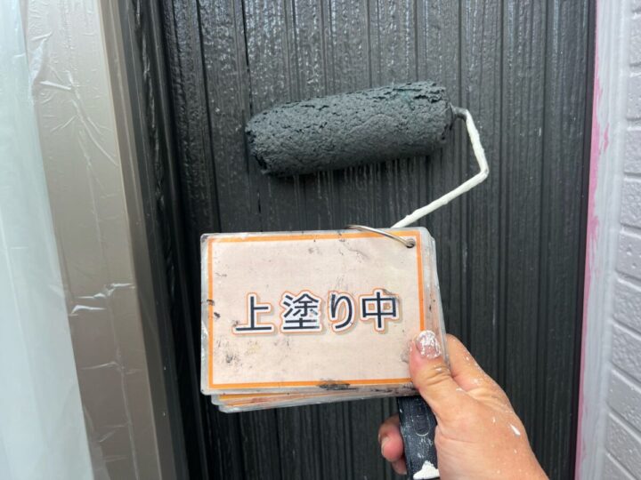 【上塗り】塗料を3回塗り重ねることで外壁の艶が増し、紫外線や雨水に強い耐久性のある外壁に仕上がります。