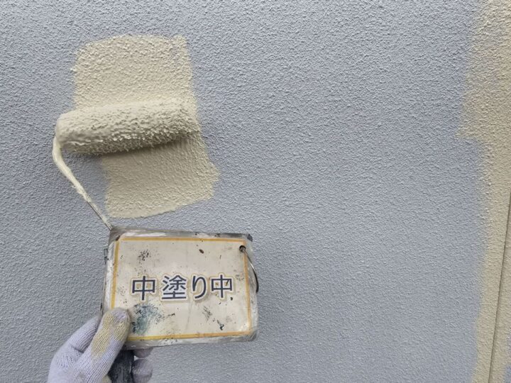 【上塗り】塗料を3回塗り重ねることで外壁の艶が増し、紫外線や雨水に強い耐久性のある外壁に仕上がります。